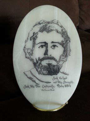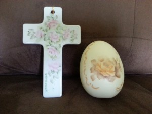 Some Easter mementos I have from my parents include this figure of Jesus in Gethsemane, a portrait of Christ which includes scenes from His life engraved in the face, a china egg and cross hand-painted by Mom, and a wooden butterfly with a cross in the center made by Mom’s cousin, Edwin (Whitey) Gohr.