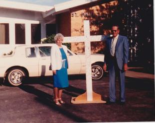 The Lenten season was a busy time for my dad. Beginning with Ash Wednesday, there were the six mid-week Lenten services to conduct, then, during Holy Week, we had a Maundy Thursday service, Good Friday services (one in the afternoon and another in the evening), and multiple services on Easter Sunday. After awhile the afternoon service on Good Friday was eliminated and the evening service became a Tenebrae service. This was one of my favorite services. And at least one year he engaged the help of John Bendull in constructing an almost life-sized cross and preparing nail pins which the members wore and then inserted into the cross on Good Friday. I still have a pin and have been wearing it this week while working at the library. Here are shown Dorothy and John Bendull at St. Paul Lutheran Church in Round Lake with the cross (on left) and pin (on right).